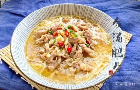 將準備好的金湯倒入鍋中煮沸。加入牛肉片,加少許鹽和雞精調味。